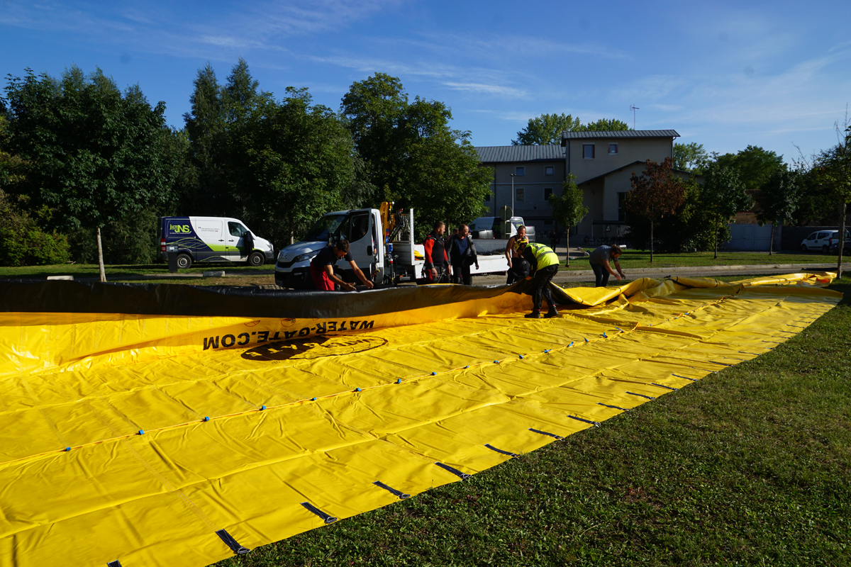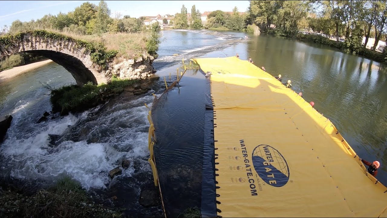 Mise hors d’eau d’un bras secondaire du Doubs à Dole par batardeaux souples Water-Gate© WA-6050 et WA-6030 afin de permettre la rénovation d’une arche patrimoniale du XVIe siècle.